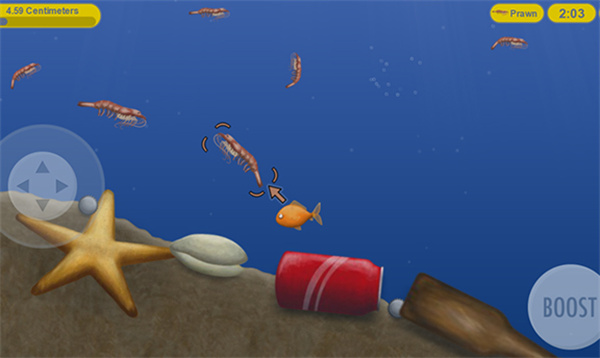 2.游戏中的控制采用虚拟摇杆操作方式,左边为控制小鱼的移动,游遍为耐力加速,点击即可获得加速效果。