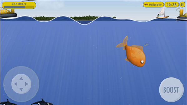 3.玩家通过滑动屏幕控制小鱼的移动,小鱼只能吃比自己小的东西。注意是“东西”,不是“食物”,所以只要是比自身个头小的物体,小到小石块,大到大轮船.战斗机,只要条件允许都能一吞而尽。甚至还能跳上岸去将陆地上的房屋,甚至灯塔装进肚子里,区区人类更是不用说了。不过要注意的是如果比自己体型大的物体有攻击性,就要多加小心了,因为不仅是你家小鱼肚子会饿。例如正在猎食的鲨鱼或大胃王鲸鱼,到了后期因为小鱼变成“水怪”,人类也会派出舰艇或者鱼雷来进行攻击。